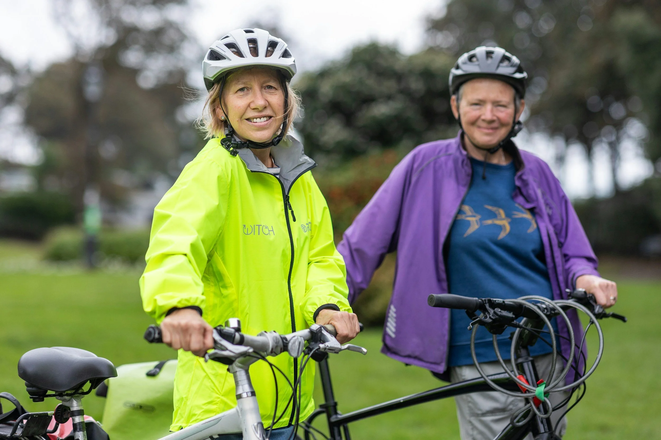 Two women in cycling helmets and jackets outdoors, standing next to their bicycles, smiling at the camera.